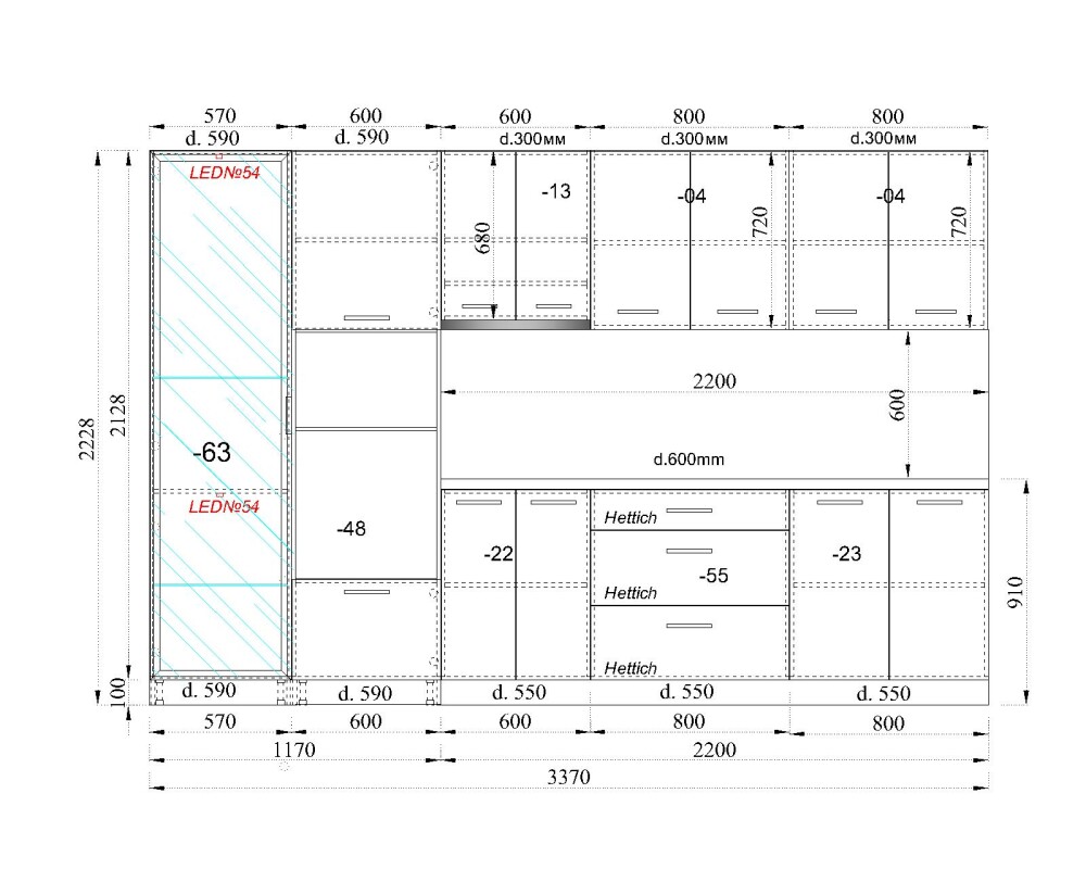 (дълбочина на шкафовете под плота – 55 см)