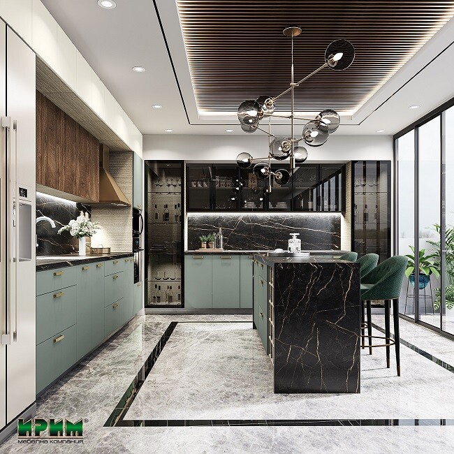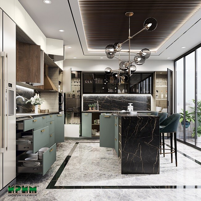 Луксозната кухня в Сити 9171 впечатлява с модерен дизайн, висококачествени материали и перфектно функционално разпределение. Долните модули са оборудвани със система InnoTech Atira за плавно прибиране, а витринните шкафове с LED осветление добавят елегантен акцент. Кухнята предлага множество възможности за вграждане на уреди и мивка, както и удобен остров с чекмеджета и бутилиери. Идеален избор за просторни и стилни интериори, съчетаващи уют и практичност.