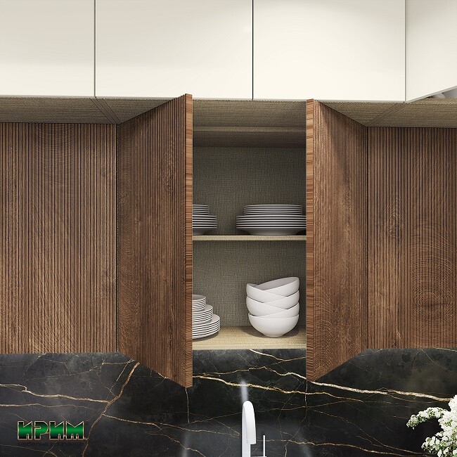 - Лице: МДФ Крийм гланц 18мм, МДФ Дъб натурал 12 18мм и МДФ Олив мат 18мм