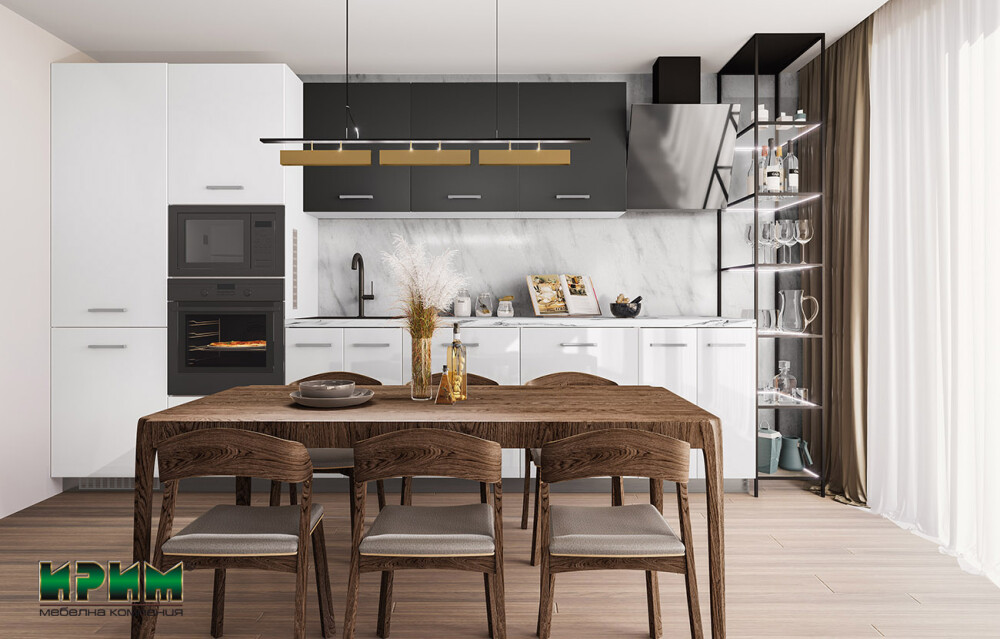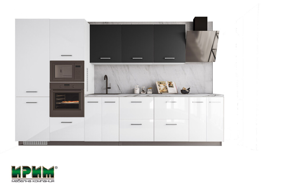 Стилната кухня в Сити 9120 впечатлява с минималистичен модерен дизайн и висококачествена изработка от МДФ. Модулите предлагат оптимална функционалност, включително възможност за вграждане на хладилник, фурна, микровълнова и мивка. Плавното затваряне на вратите и удобните чекмеджета осигуряват комфорт и дълготрайност в ежедневната употреба. Горните шкафове в Карбон мат придават елегантен акцент, а термоплотът в бял мрамор завършва цялостната визия.