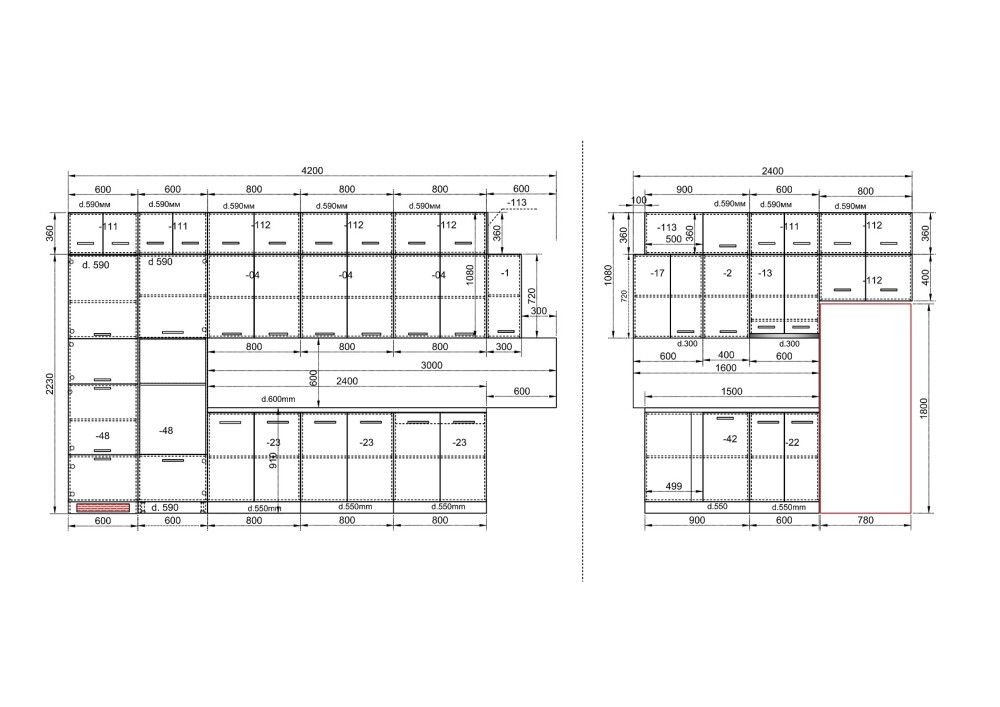 - Два колонни модула с четири врати с възможност за вграждане на фурна и микровълнова с височина 38см БФ-Карбон мат-11-48 - 60/59/223см.