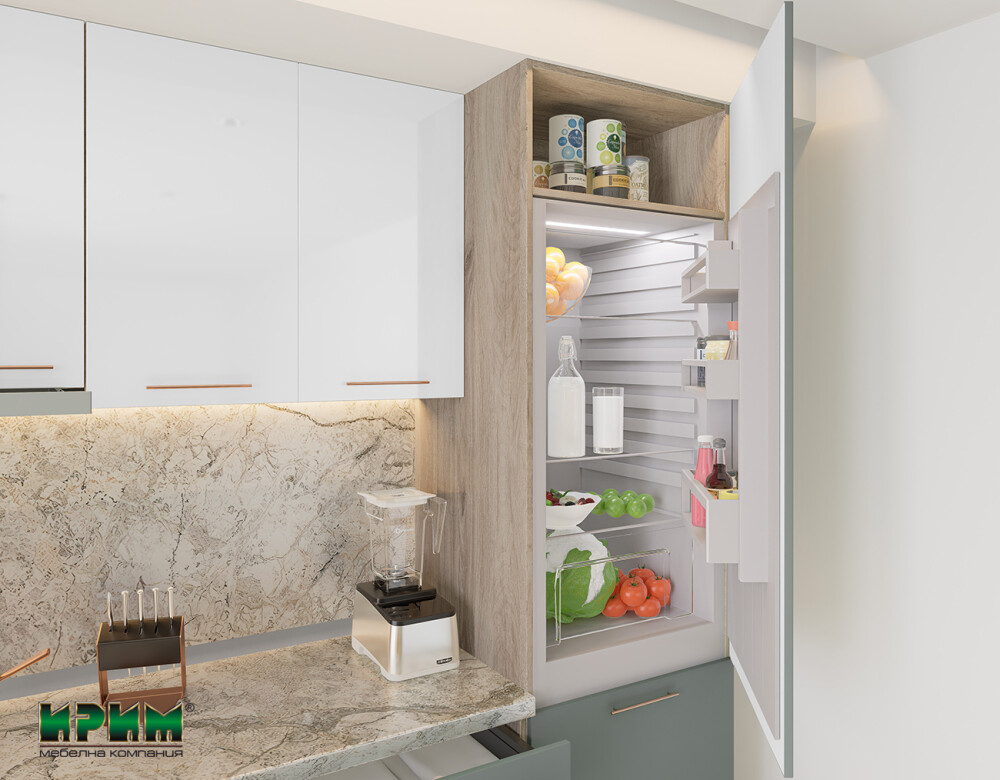 - Лице: МДФ Олив мат 18мм и МДФ Бяло гланц 18мм