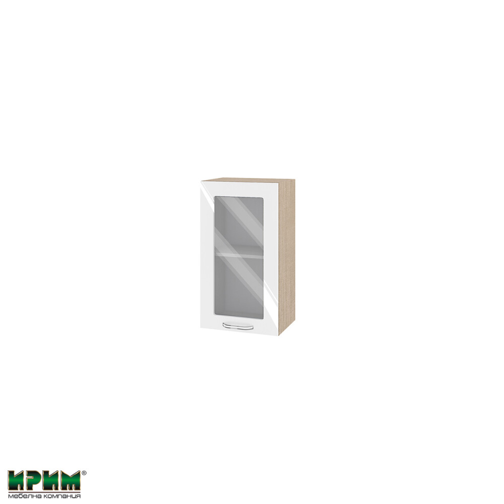 Горен модул с витринна врата и рафт МФ-Бяло гланц-05-202