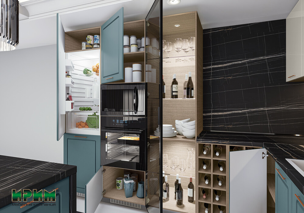 - Колонен шкаф с четири врати, възможност за вграждане на фурна и микровълнова с височина 38 см МФ-Деним мат-06-48 - 60/59/223см.