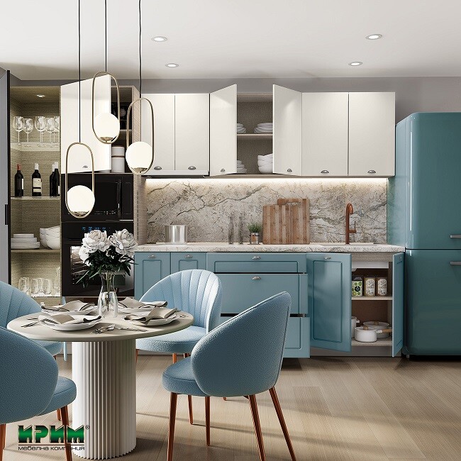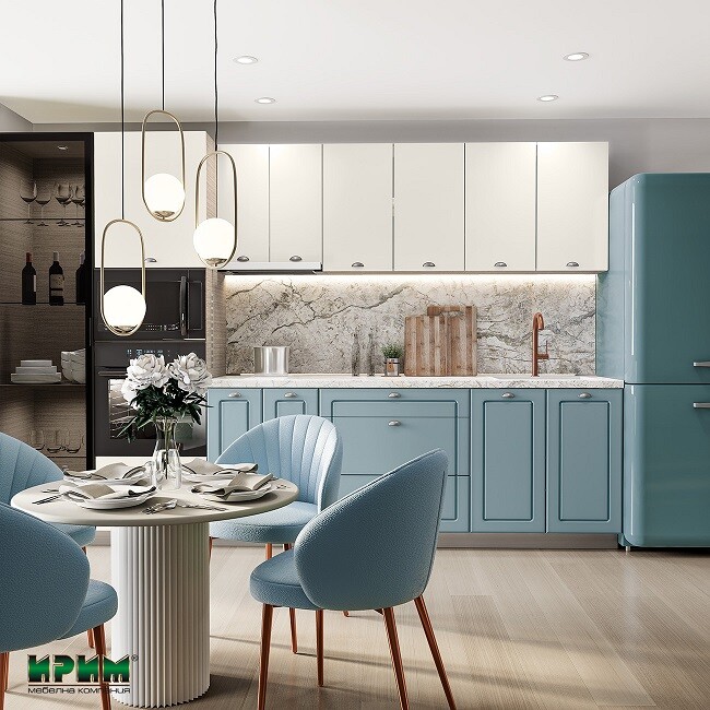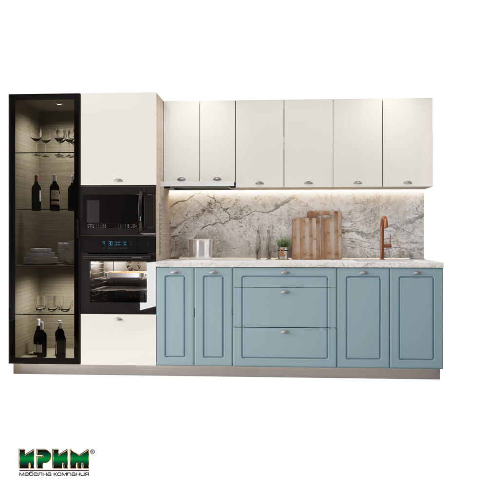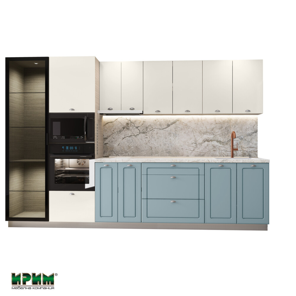 Кухня Сити 9166 впечатлява с модерен контраст между матов деним и елегантен кремов гланц , подчертан от термоплот „Небула“ и LED осветление . Функционалните модули с плавно затваряне и възможност за вграждане на уредите и мивката осигуряват максимален комфорт и практичност. Изработена от висококачествен МДФ и корпус от ПДЧ в цвят мока , кухнята съчетава стил, надеждност и дълготрайност. Перфектният избор за съвременен дом с вкус към изисканите детайли.