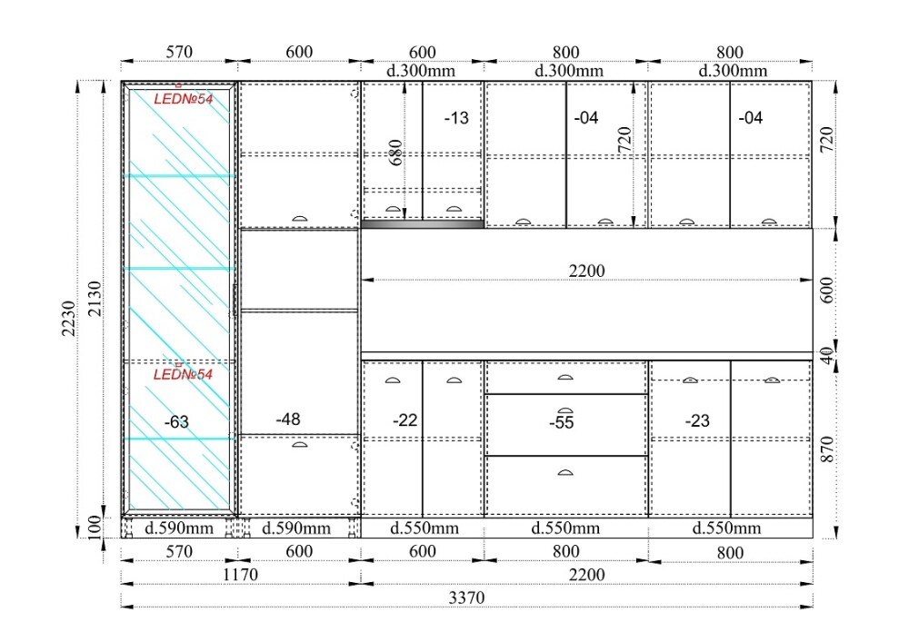 - Колонен шкаф със стъклена врата Алу Глас и три стъклени рафта с LED осветление МАЛ-63 - 57/59/223см.