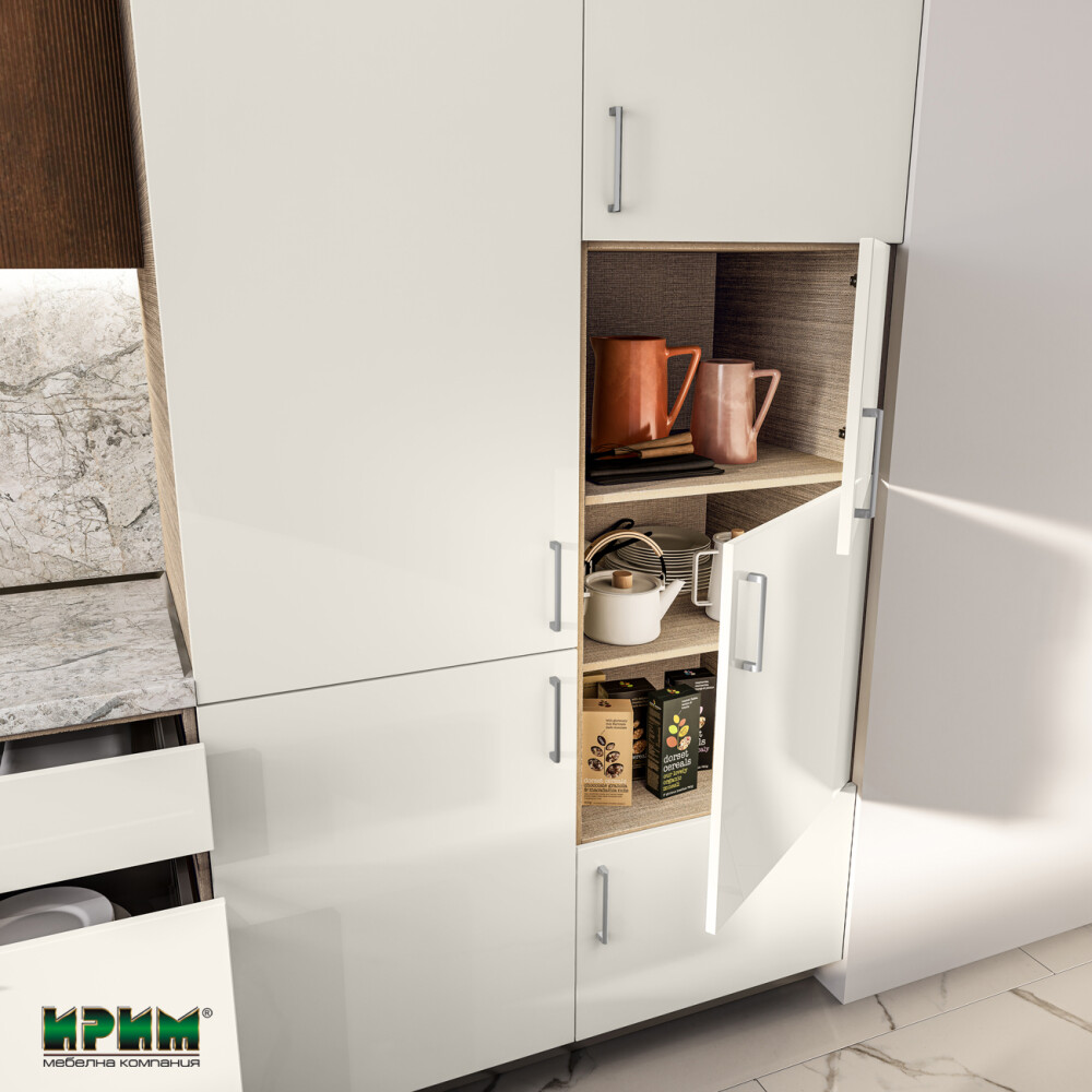 - Два колонни с четири врати и възможност за вграждане на фурна и мирковълнова с височина 38см МФ-Крийм гланц-11-48 - 60/59/223см