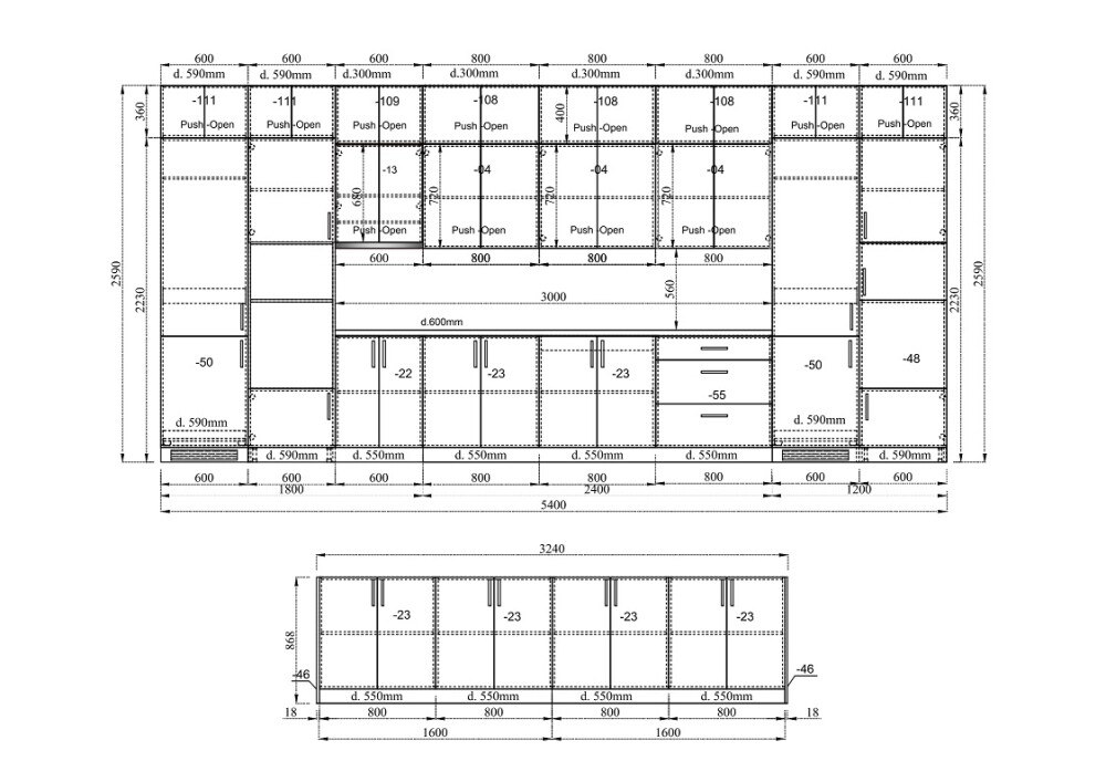 (дълбочина на шкафовете под плот – 55 см)