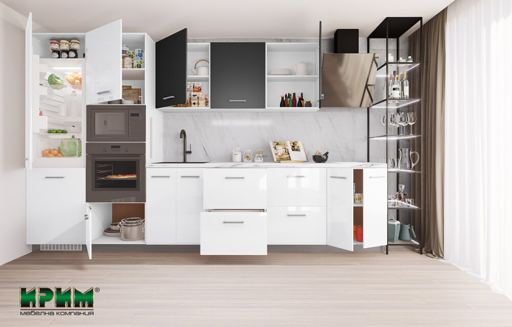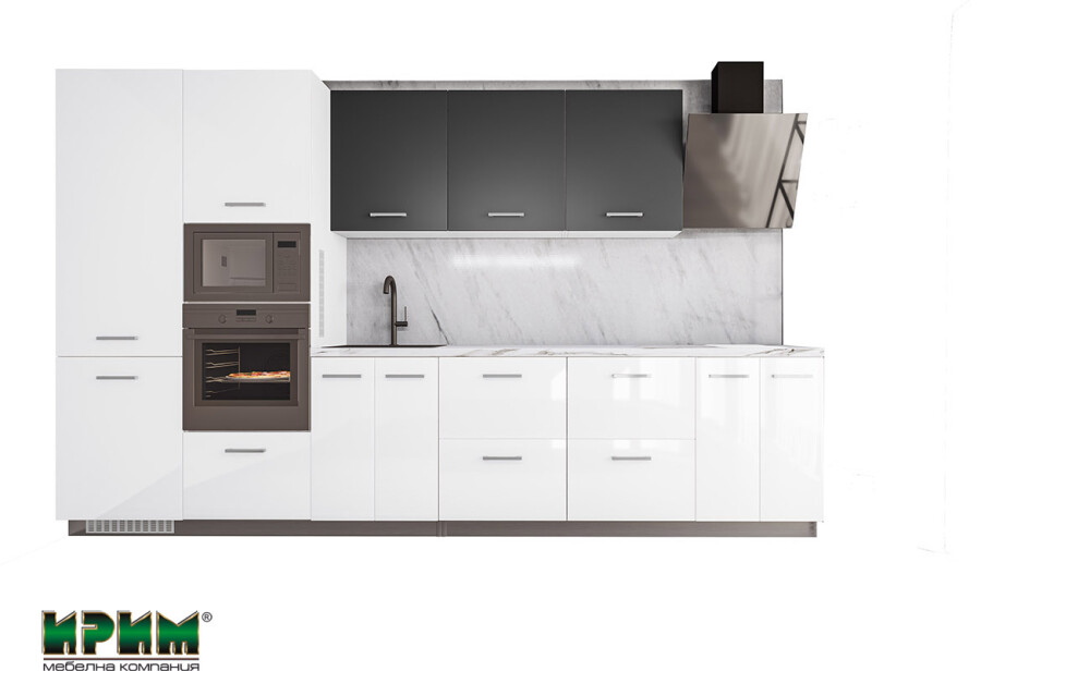 Кухня Сити 9120 впечатлява с модерен контраст между светъл гланц и тъмен мат , придавайки изискан и минималистичен характер на всяко пространство. Изработена от висококачествен МДФ , тя предлага плавно затваряне на вратите , възможност за вграждане на мивка и уреди , както и ергономично подредени модули за максимален комфорт. Термоплотът в цвят Бял мрамор и металните дръжки завършва елегантната визия на тази функционална и стилна кухня.