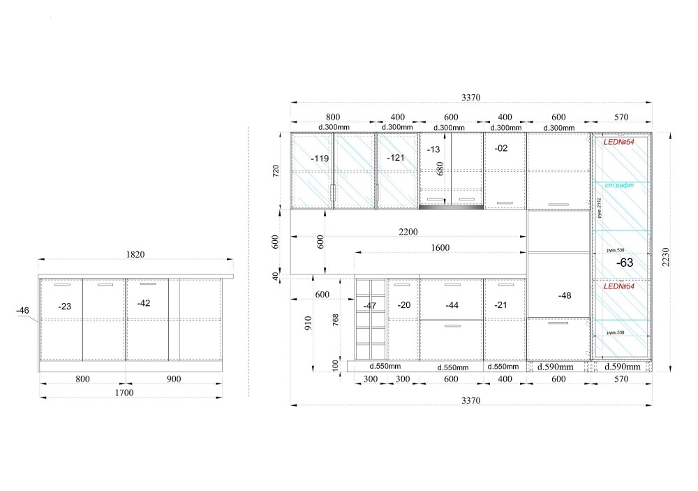 (дълбочина на шкафовете под плот – 55 см)