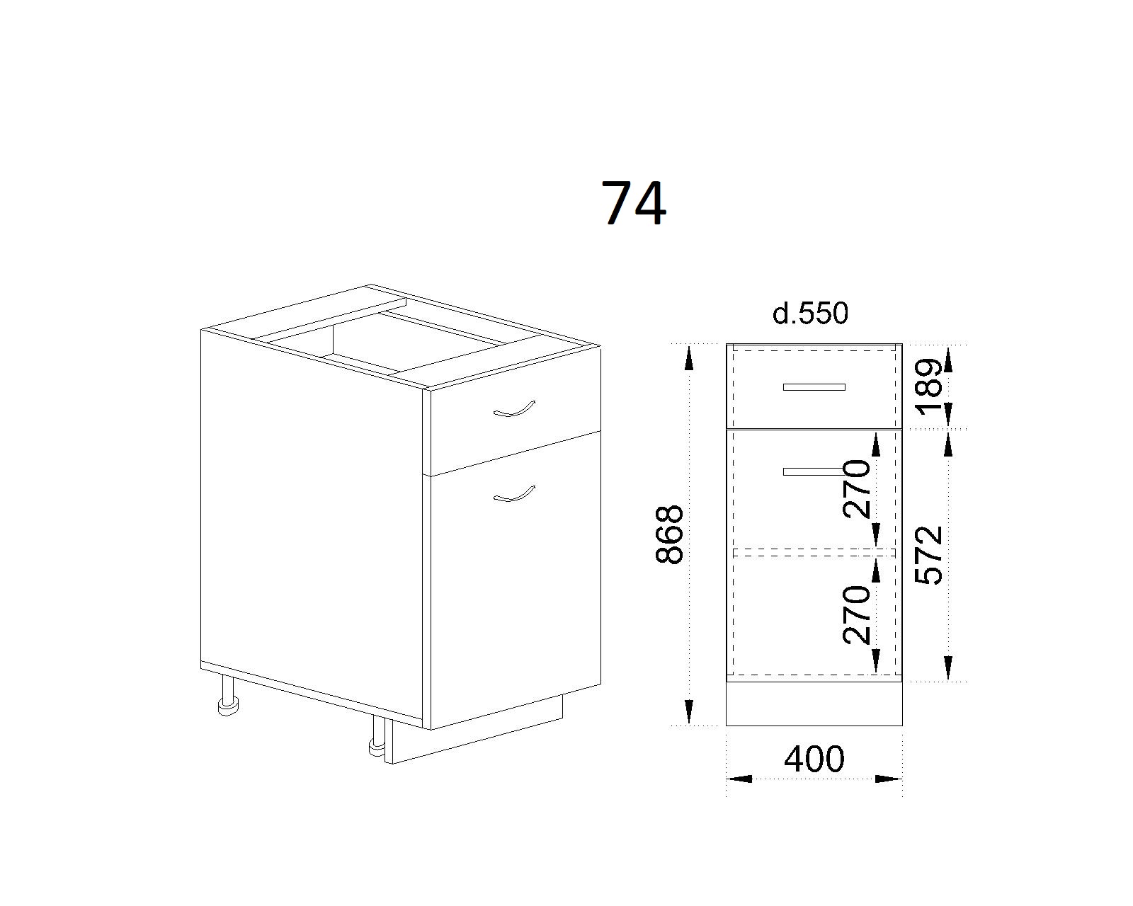 Долен модул с чекмедже,врата и рафт БФ-Бяло фладер-04-74 (ляв)
